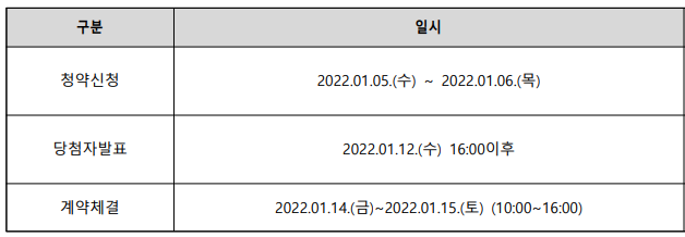 1. 청약일정 : 22.01.05 (수) ~ 22.01.06 (목)